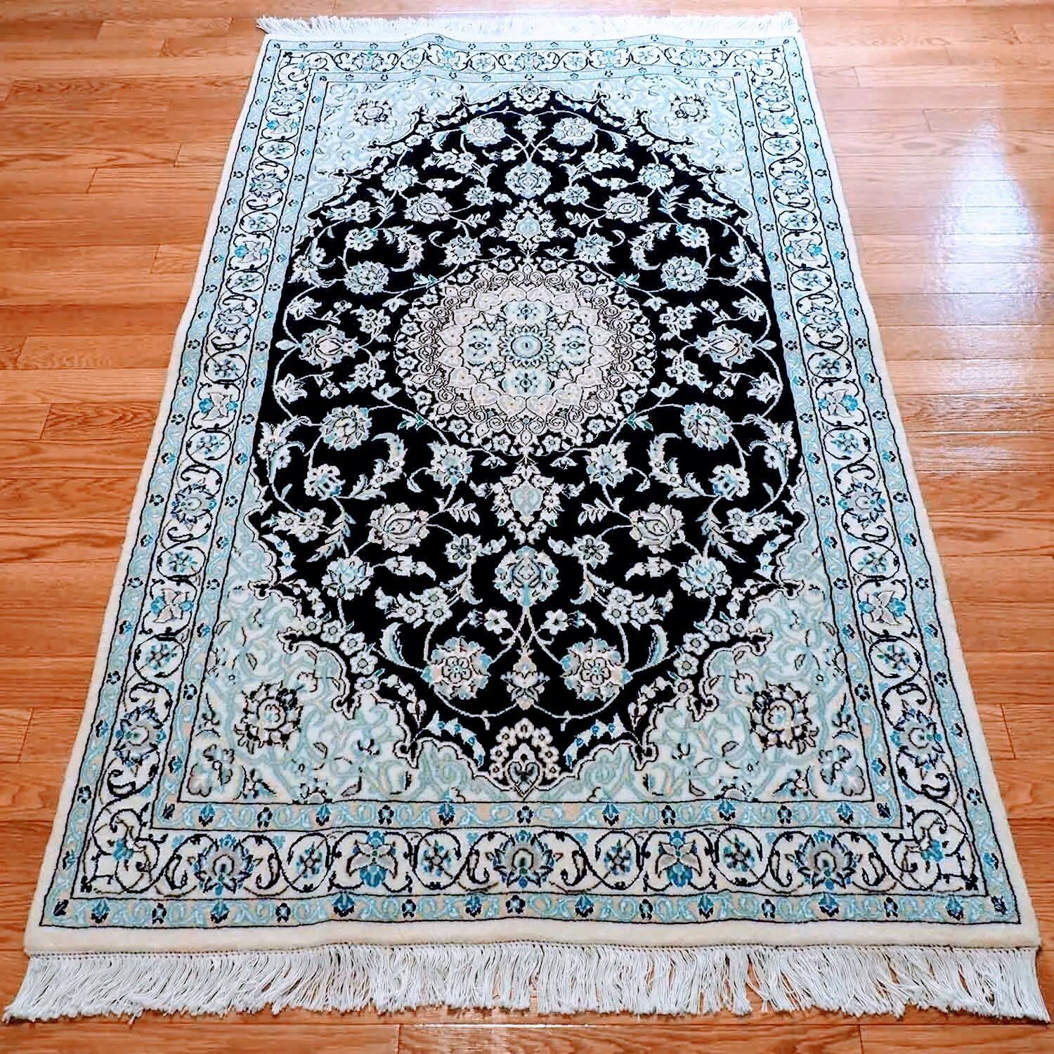 ペルシャ絨毯 ナイン産 紺色( ネイビー) 手織り シルク&ウール イラン直輸入 本物保証 ラグ 116×187
