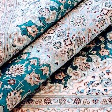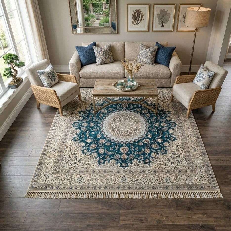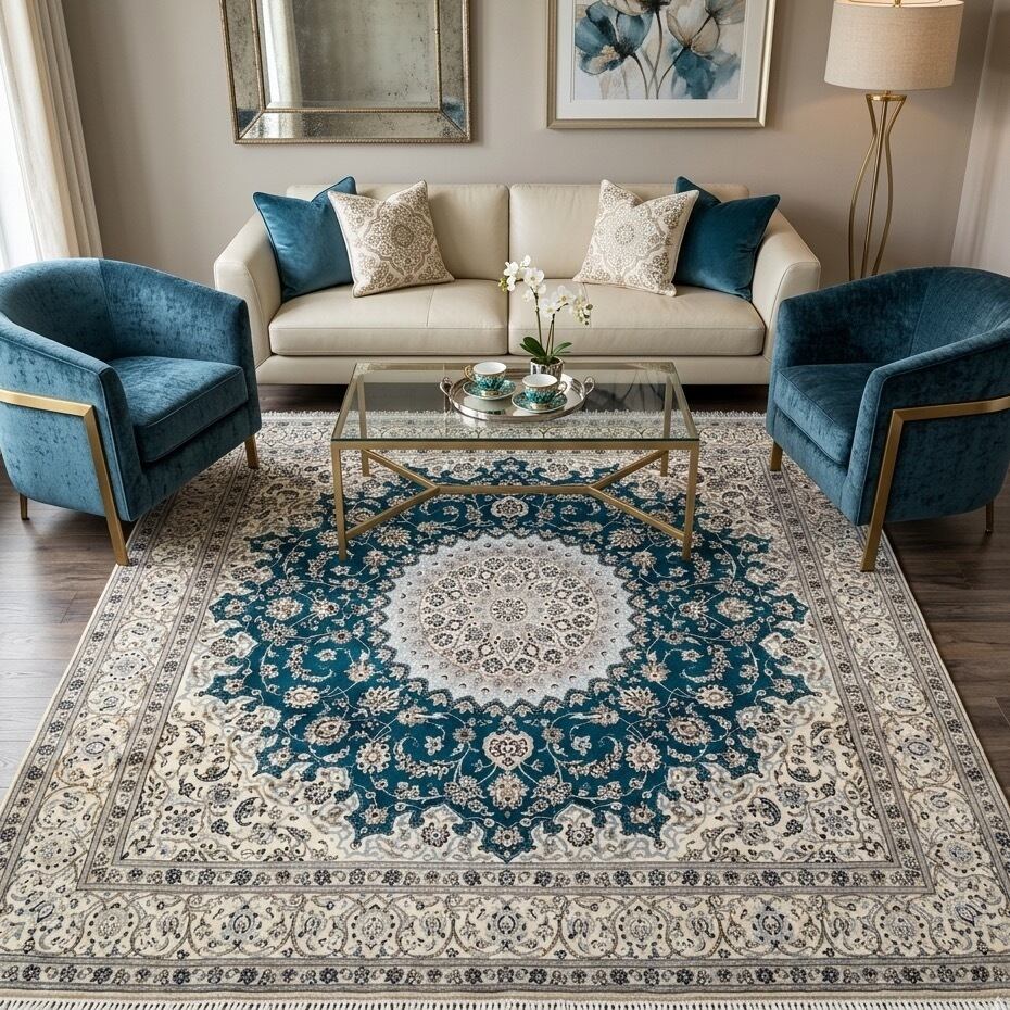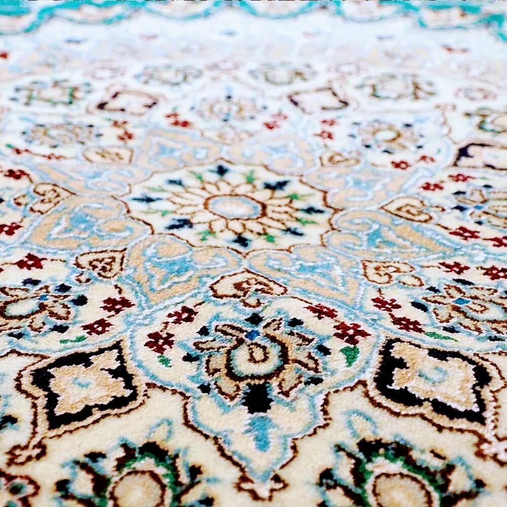 ナイン絨毯の象徴であるアイボリーと、深みのあるエメラルドブルーのコントラストは、まるで宮殿のような静謐さと気品を空間に醸し出します。