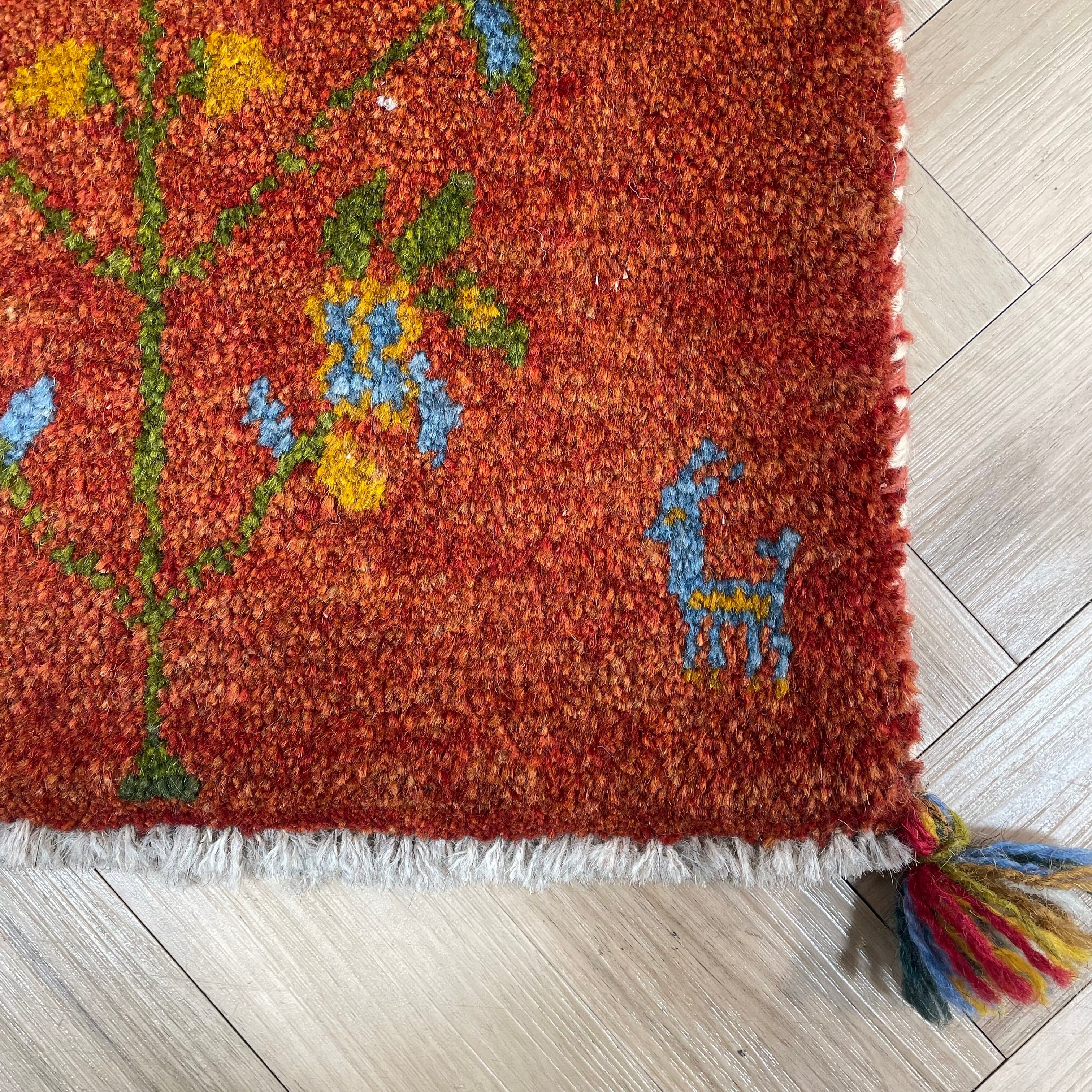 鮮やかな赤(茜色)のフィールドに、生命を象徴する「生命の樹」が丁寧に織り込まれており、四隅のマルチカラーのタッセルが可愛らしいアクセントになっています。