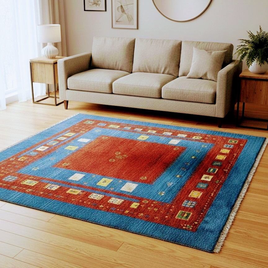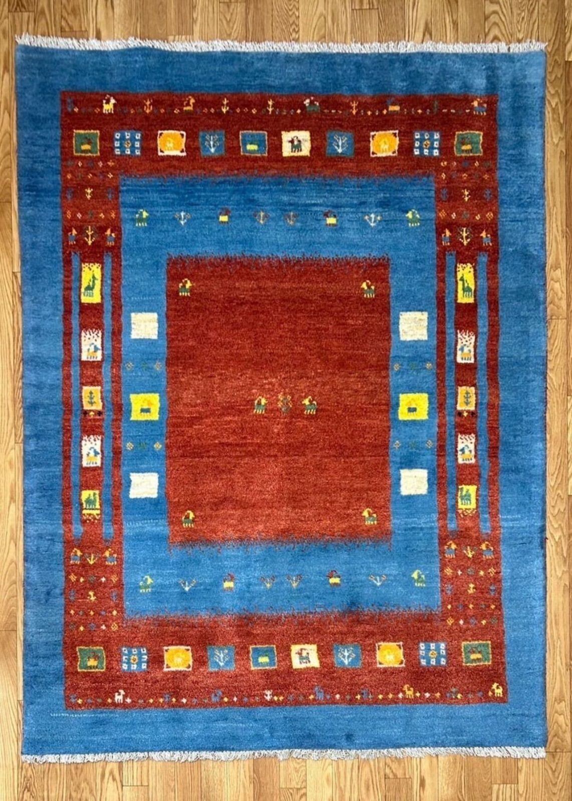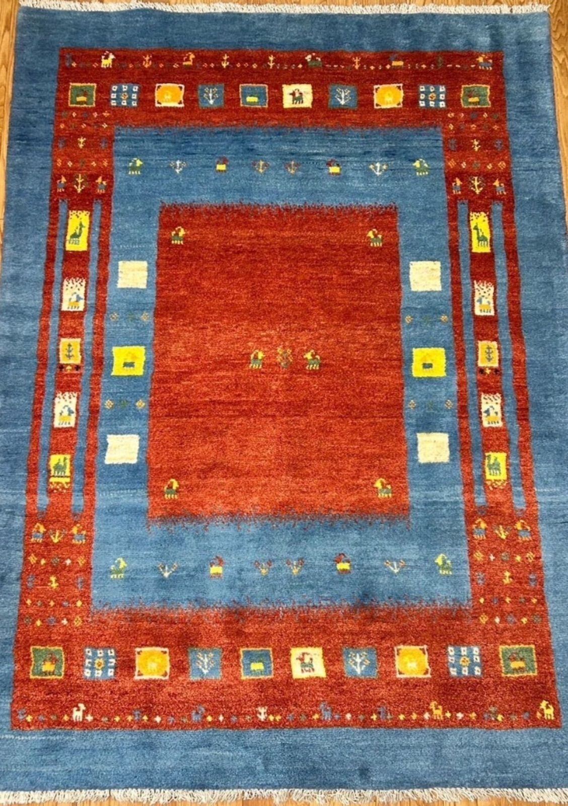 ペルシャ 美色彩 ギャッベ 150×200cm ブルー×レッド 本物 ペルシャ 手織り絨毯 ロルバフ 1点物