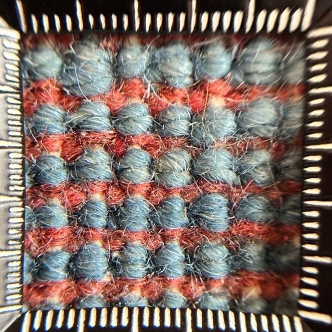鮮やかなアートのようなブルーの枠取りと、中央の深いレッドが織りなすコントラストが素晴らしく、お部屋の主役になる存在感があります。